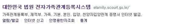 이게 불편하신 분들은 자주 사용하시는 포털사이트에 전자가족관계등록시스템 혹은 가족관계증명서 발급을 검색하면 해당 주소를 쉽게 접속하실 수 있습니다.