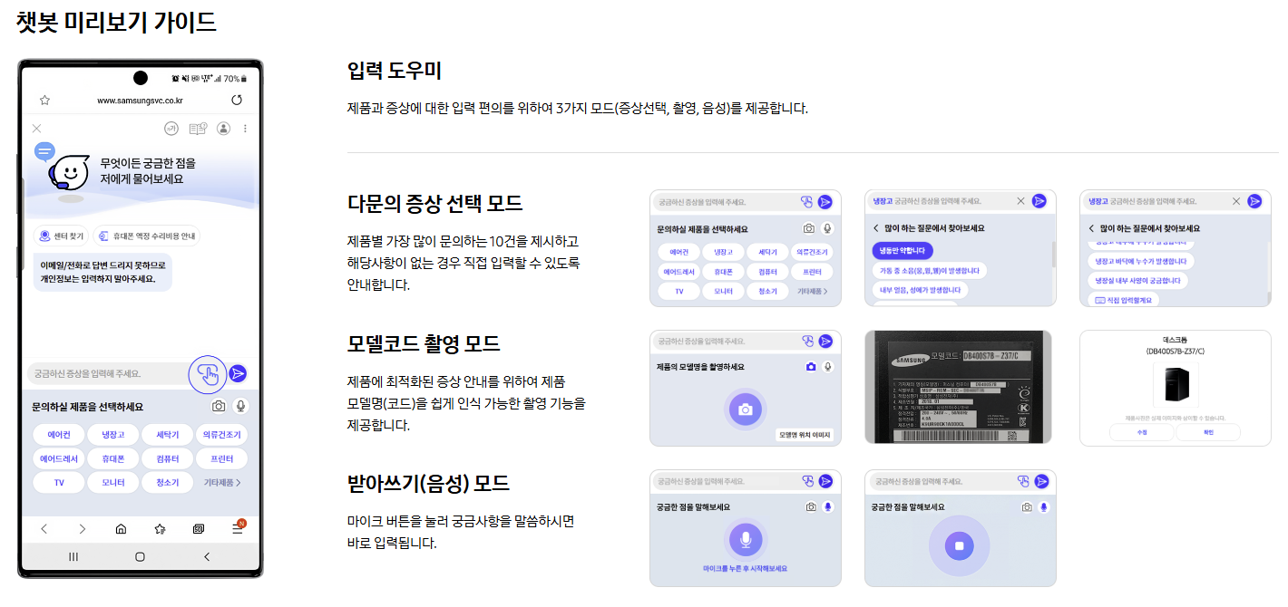 삼성전자 공식 웹사이트와 모바일 앱에서는 챗봇을 통해 간단한 문의를 해결할 수 있습니다. 챗봇은 24시간 운영되며, 기본적인 제품 사용법과 문제 해결 방법을 제공합니다.