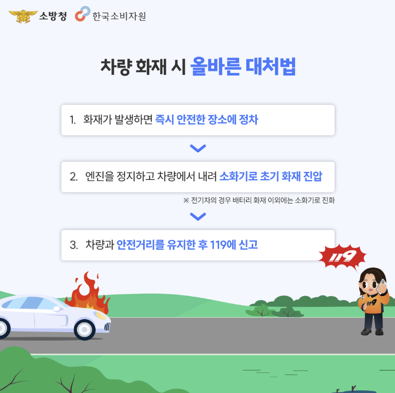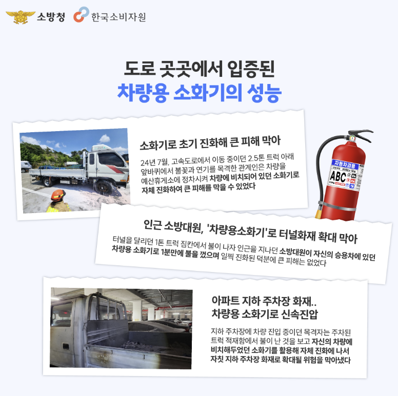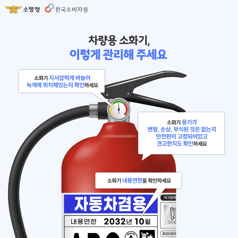 소화기를 준비하고 관리하는 작은 실천이 우리의 안전을 지키는 첫걸음이 될 수 있습니다. 만일 아직 차량용 소화기가 없다면 자동차 겸용 소화기를 준비하시고 정기적으로 상태를 점검해 주세요. 화재 없는 안전한 도로 환경을 만들기 위해 모두가 함께 노력해야겠습니다.