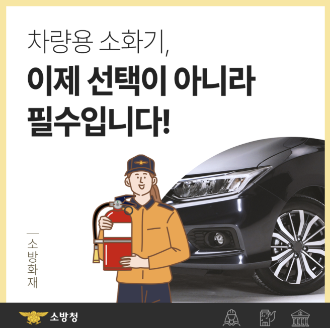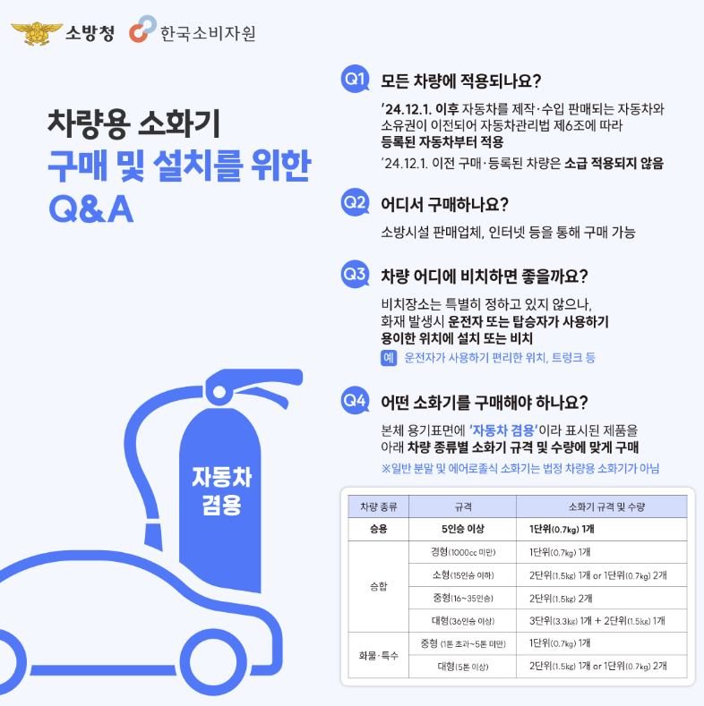 소방시설 설치 및 관리에 관한 법률 개정에 따라 2024년 12월 1일부터 5인승 이상 차량에는 반드시 차량용 소화기를 설치해야 합니다.