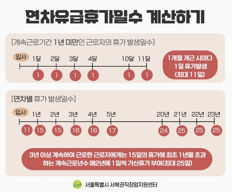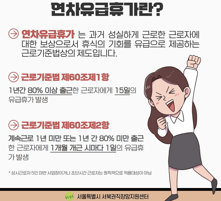 | 연차유급휴가 발생 조건 | - 상시 근로자 5인 이상 사업장 - 4주 평균 1주 15시간 이상 근무 - 1년 80% 이상 출근 시 15일 부여 - 1년 미만 또는 80% 미만 출근 시 1개월 개근당 1일 부여 |