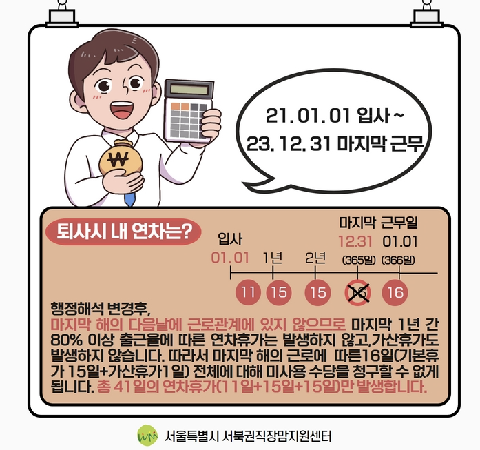 - 퇴직자의 연차수당: 퇴직하는 근로자에게는 미사용 연차에 대한 수당을 퇴직일로부터 14일 이내에 지급해야 합니다.
