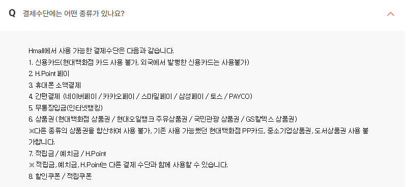 A2. 신용카드, 체크카드, 계좌이체, 가상 계좌, 현대Hmall 포인트 등 다양한 결제 방법이 제공됩니다.