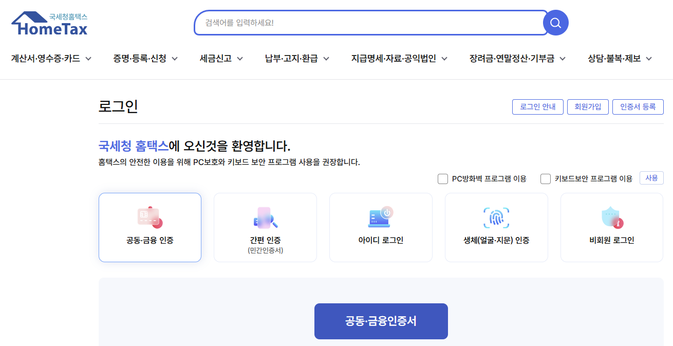 - 로그인: 상단의 '로그인' 버튼을 클릭하여 공인인증서 또는 간편 인증을 통해 로그인합니다.