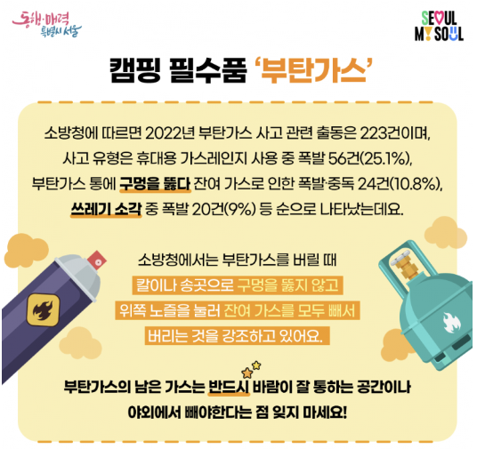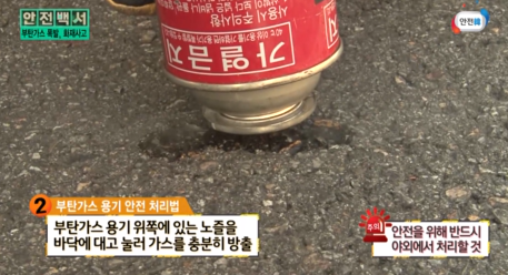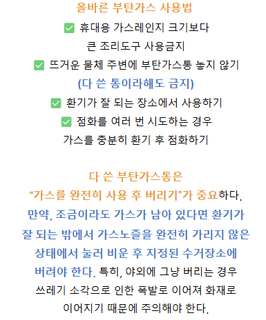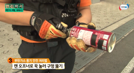- 부탄가스는 인화성이 강해 불꽃이나 전기 스파크로 인해 폭발할 수 있으므로 화기 근처에서 처리하지 마세요.