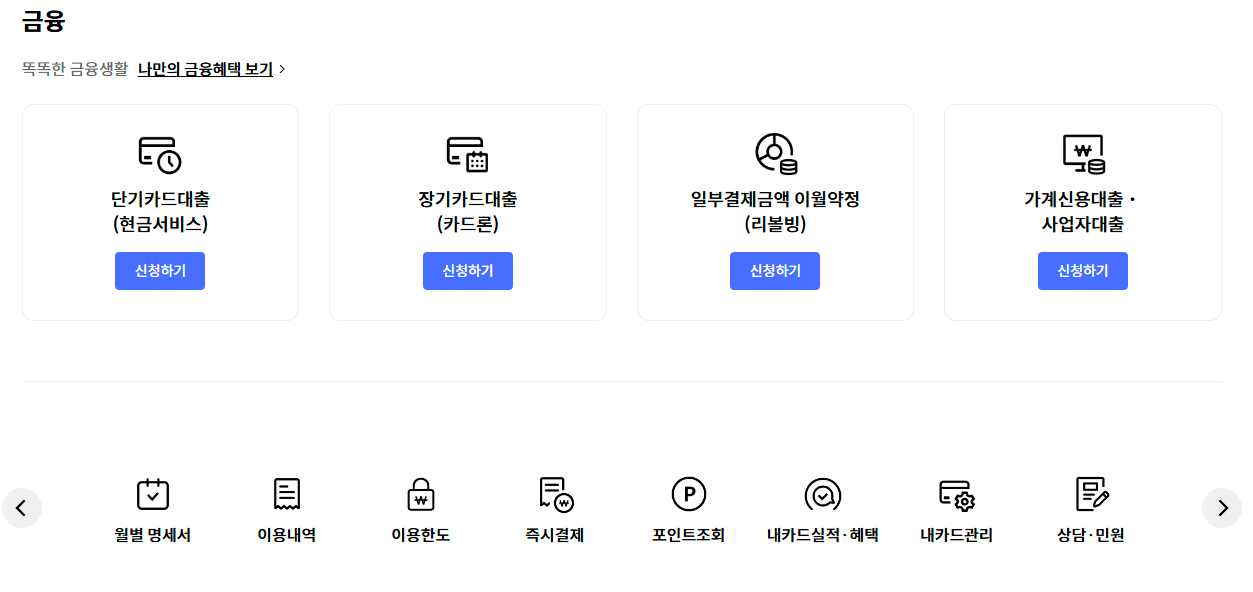 - 카드 분실 신고 및 재발급: 카드를 분실했을 경우, 홈페이지에서 즉시 신고하고 새로운 카드를 신청할 수 있습니다.