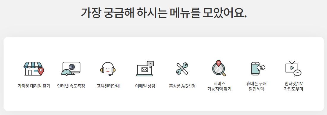 KT 공식 홈페이지나 모바일 앱을 통해 대부분의 서비스 문의를 처리할 수 있습니다. 요금 조회, 결합상품 가입, 데이터 추가 구매, 멤버십 혜택 확인 등 다양한 기능을 제공하며, 간단한 변경 신청도 가능합니다.