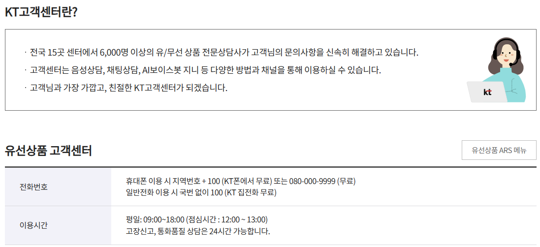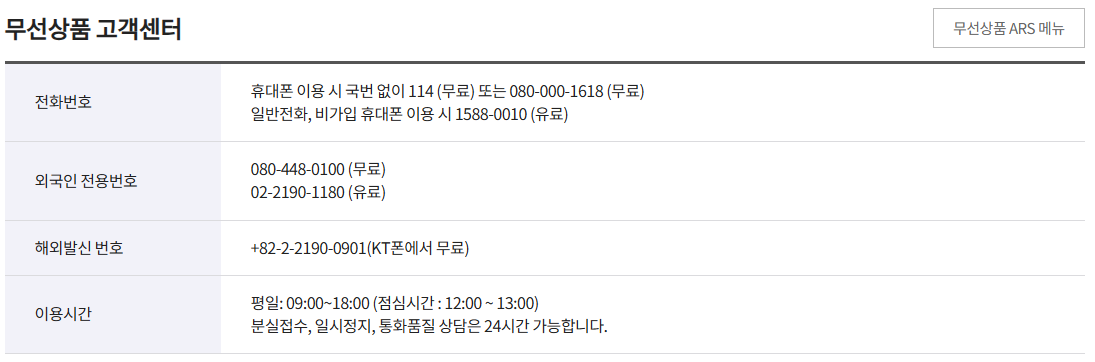 114(KT 고객 무료), 일반전화에서는1588-0010또는080-000-1618(무료) - 운영 시간: 평일 오전 9시~오후 6시, 주말 및 공휴일 휴무