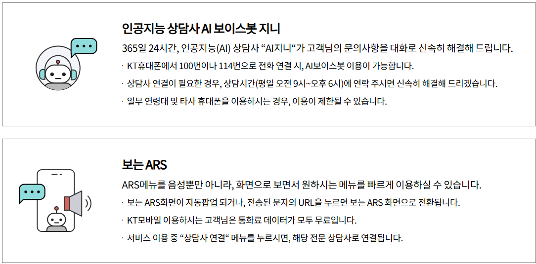 - KT 챗봇 상담: KT 홈페이지 및 모바일 앱에서 이용 가능