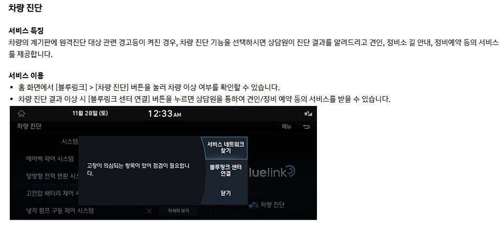 블루링크는 차량의 상태를 실시간으로 모니터링하여 운전자에게 전달합니다. 이를 통해 차량의 이상 여부를 조기에 발견하고, 필요한 정비나 점검을 신속하게 진행할 수 있습니다. 또한, 주행 거리나 연료 잔량 등의 정보도 확인할 수 있어 효율적인 차량 관리가 가능합니다.
