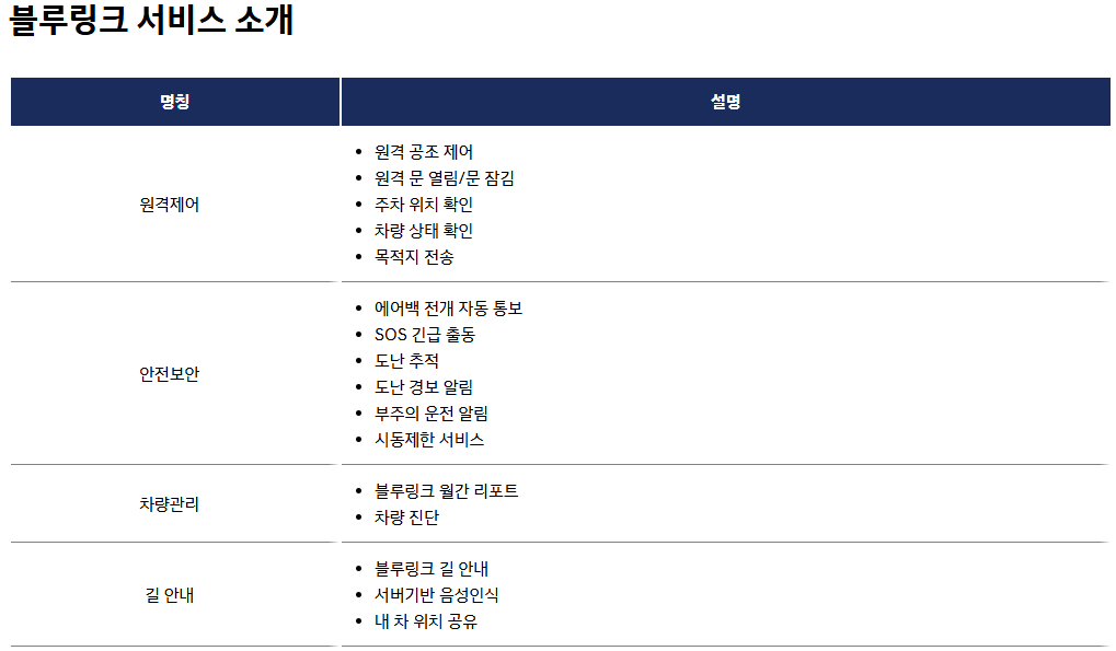 블루링크는 운전자의 편의와 안전을 위한 다양한 기능을 제공합니다. 아래는 블루링크의 주요 기능들입니다.