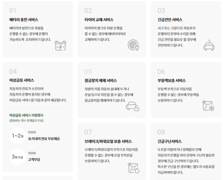 - 배터리 방전, 타이어 펑크, 차량 고장 등 긴급출동 지원