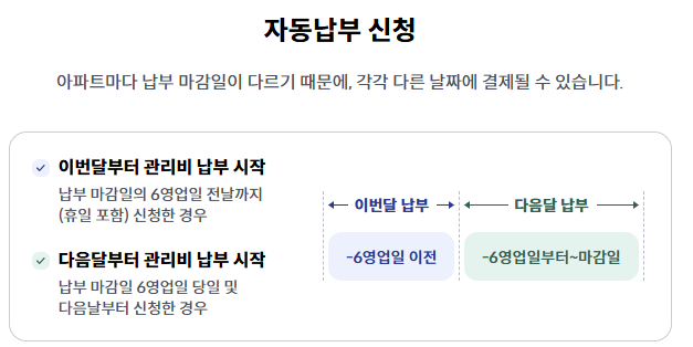 ✅ 일반적으로 신청 후 다음 달 또는 다다음 달부터 출금이 시작됩니다. (처리 기간은 아파트마다 다를 수 있음)