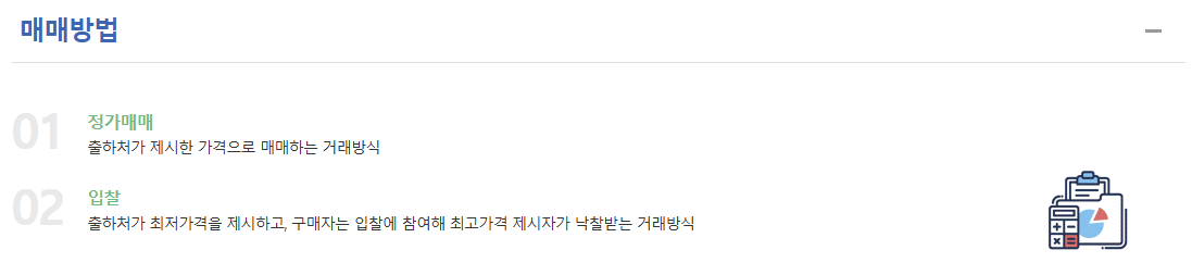 거래는 크게 경매 방식과 정가·수의매매 방식으로 나뉘며, 원하는 방식을 선택하여 거래할 수 있습니다.
