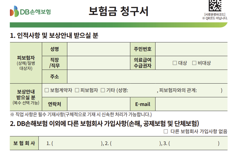보험금 청구서는 DB손해보험에서 제공하는 공식 서식으로, 보험사 홈페이지나 모바일 앱에서 다운로드할 수 있습니다. 이 서류에는 청구인의 개인정보, 보험금 지급 계좌번호, 치료 내용 등이 포함되어야 합니다.
