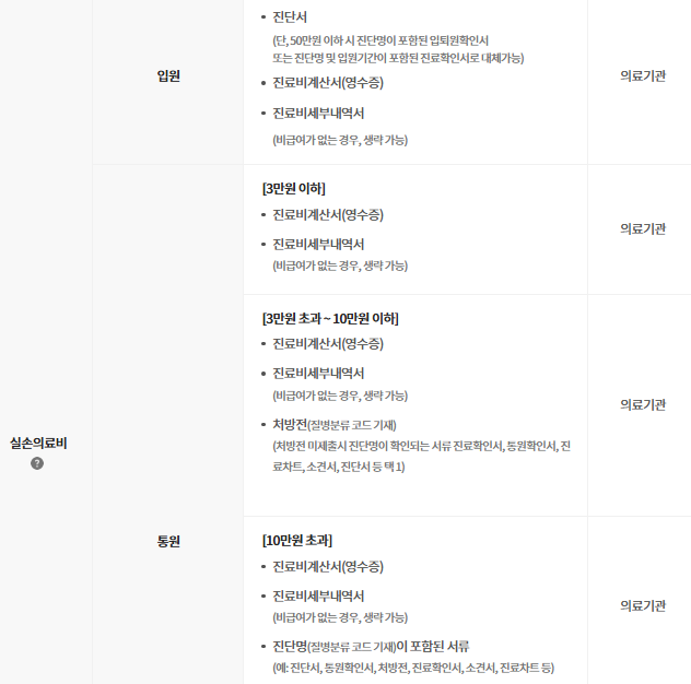 | 50만 원 이하 | 진료비 영수증 + 입·퇴원 확인서 또는 진료 확인서 |