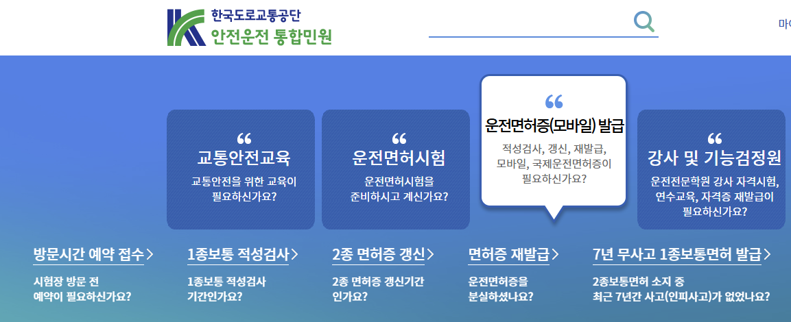 ✔ 1종 보통 및 2종 면허는 '안전운전 통합민원' 홈페이지에서 온라인으로 적성검사 및 갱신 가능