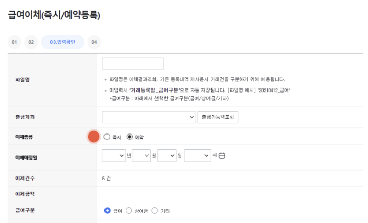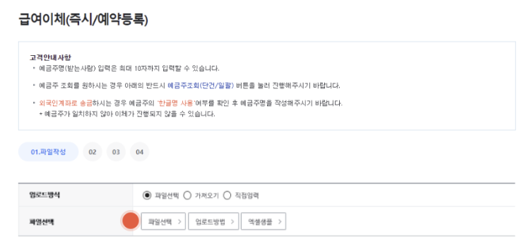 - 지정된 급여일에 다수 직원에게 급여를 일괄 이체할 수 있으며, 사전에 등록된 급여 데이터를 불러와 자동화된 지급 처리가 가능합니다.