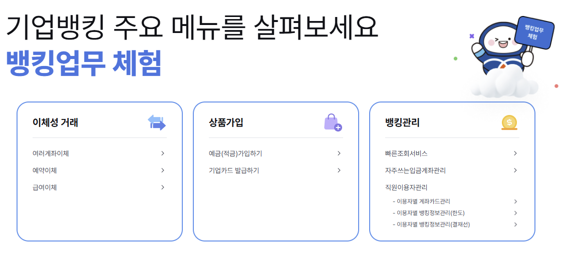 IBK 기업인터넷뱅킹은 단순한 이체 기능 외에도 기업 운영에 필수적인 고급 기능을 다수 포함하고 있습니다.