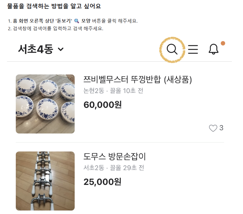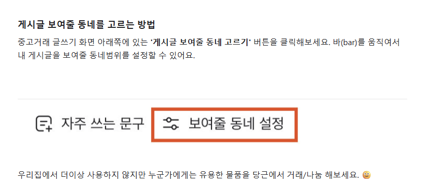 | 거래 지역 설정 | 실제 거래 가능한 지역으로 설정, ‘두 동네 글쓰기’ 기능 활용 가능 |