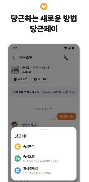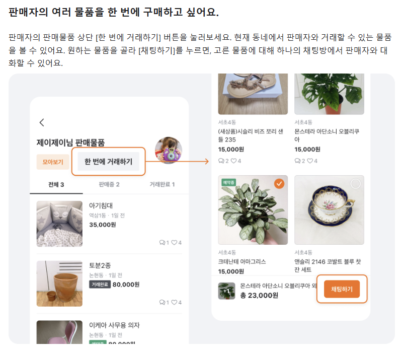 판매글이 등록되면, 구매 희망자가 채팅을 통해 문의를 하게 되며, 대화를 통해 거래 일정을 조율하고 물건을 전달하는 방식으로 거래가 진행됩니다. 거래가 끝난 후에는 상태를 ‘거래완료’로 변경하여 다른 이들의 문의를 방지할 수 있습니다.
