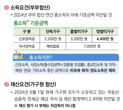 | 홑벌이가구 | 3,200만 원 미만 | 285만 원 | 부양가족 있음, 배우자 소득 300만 원 미만 |