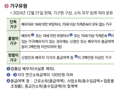 단독가구는 배우자, 부양 자녀, 또는 부모와 함께 살지 않는 1인 가구를 말합니다. 흔히 미혼 근로자 또는 독거노인 등이 여기에 해당할 수 있습니다. 홑벌이 가구는 배우자가 있거나, 자녀 또는 부모 등 부양가족이 있지만 소득이 없는 경우를 말합니다. 맞벌이 가구는 본인과 배우자 모두 일정 수준 이상의 소득이 있는 경우입니다.