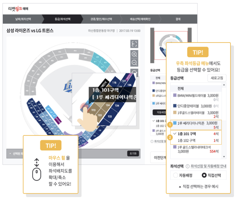 구장별 좌석 배치를 확인하고, 본인이 원하는 위치의 좌석을 클릭하여 선택합니다. 좌석 등급별 가격이 다르므로 참고하여 예매하세요.