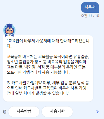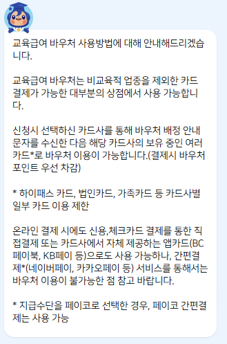 - 교육 콘텐츠 플랫폼: 인강 사이트, 전자책 서점 등에서 바우처 결제 허용. 수험서, 논술책, 학습 동영상 등도 결제 가능.