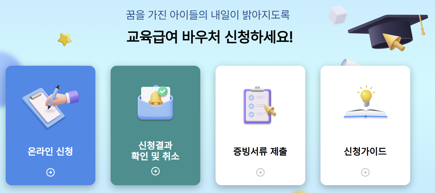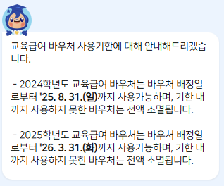 - 사용 기한 확인: 대부분의 교육급여 바우처는 연도별 지급이며, 사용 기한이 지나면 자동 소멸됨. 일정 확인 후 계획적으로 사용하는 것이 중요.