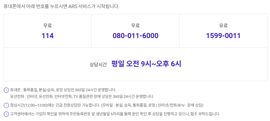 이처럼 상담 목적에 따라 전화번호가 분리되어 있으므로, 단순 요금제 문의인지, 단말기 문제인지, 해외 로밍 관련인지에 따라 적절한 번호를 선택해야 상담이 원활하게 진행됩니다.
