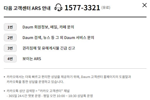 - 카카오에서는 더욱 빠르고 편리한 상담을 제공하기 위해, Daum 고객센터 홈페이지의 도움말과