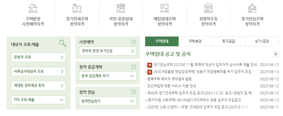 청약이 완료된 후 당첨자 발표는 지정된 발표일에 맞춰 이루어지며, 홈페이지 로그인 후 ‘대상자 조회’ 메뉴를 통해 직접 확인할 수 있습니다. 이 메뉴에서는 당첨자뿐 아니라 서류심사 대상자, 입주예정자 명단, 보수처리 조회, 납부금 조회도 함께 확인할 수 있어 이후 절차를 원활하게 진행하는 데 도움이 됩니다.