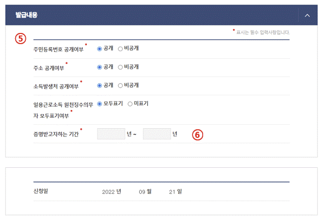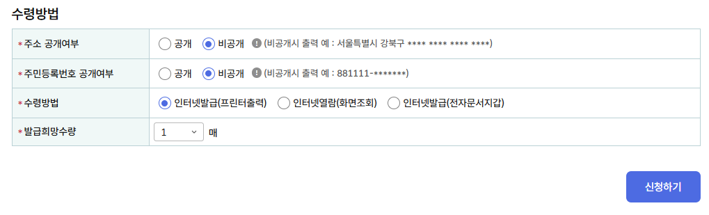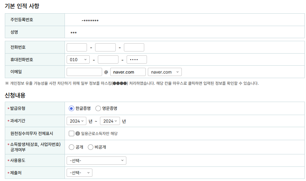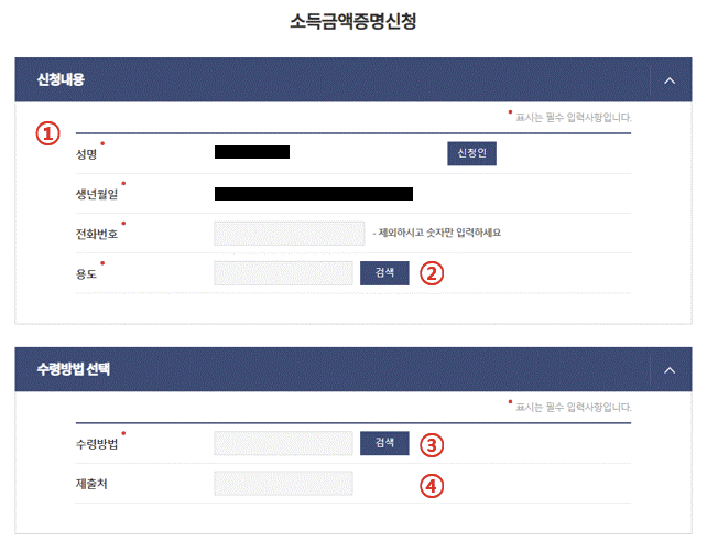 연도, 제출처, 사용 목적, 수령 방식 등을 입력하고 신청을 완료합니다. - 출력 또는 저장