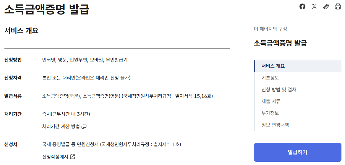 또한 본인의 소득 내역이 국세청에 정상적으로 신고되어 있어야 발급이 가능하며, 무소득자나 소득 미신고자는 증명서가 발급되지 않습니다. 이런 경우에는 ‘사실증명’이나 ‘납세사실 없음 증명’ 등의 다른 서류를 발급해야 하니 용도에 따라 구분해 주의하시기 바랍니다.