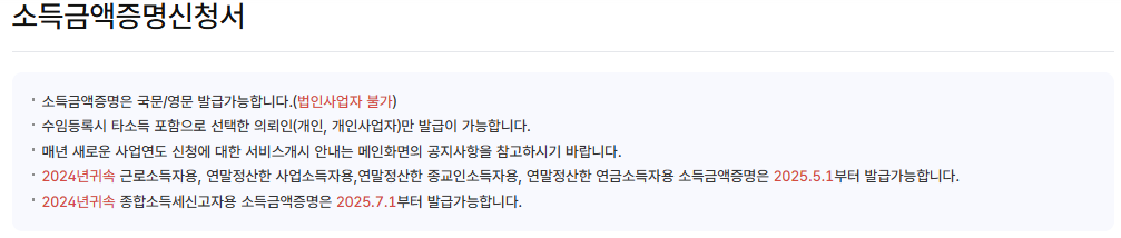 소득금액증명원은 연말정산이나 종합소득세 신고가 완료된 후부터 발급할 수 있습니다. 근로소득자는 보통 매년 5월부터, 종합소득세 신고자는 7월 1일 이후부터 발급이 가능합니다. 예를 들어 2024년도 소득 내역은 2025년 5월 또는 7월 이후에 증명원으로 확인할 수 있습니다.