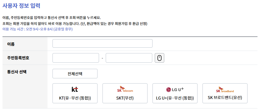 2️⃣ 이름과 주민등록번호를 입력하고, 환급 대상 통신사(예: KT, SKT, LG U+, SK브로드밴드 등)를 설정합니다