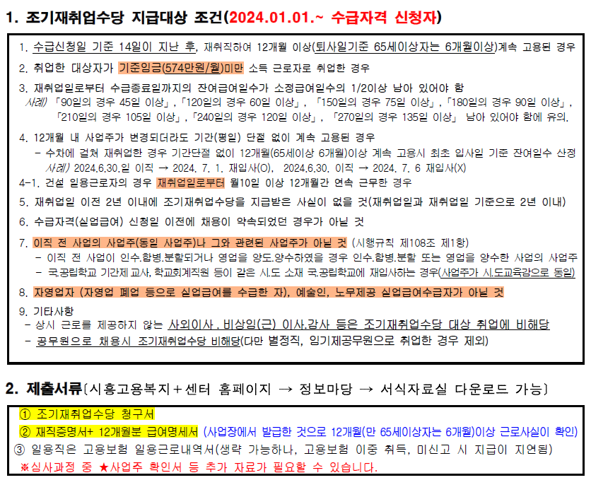 조기 재취업수당은 단순한 실업급여 보완이 아니라, 조기 복귀자에게 실질적 보상을 제공함으로써 재취업 의지를 높이는 좋은 제도입니다. 실업급여 수급 중 갑작스럽게 재취업하게 되었더라도, 이 수당을 통해 남은 금액 일부를 보전받을 수 있으니 적극 활용해보시길 권합니다.