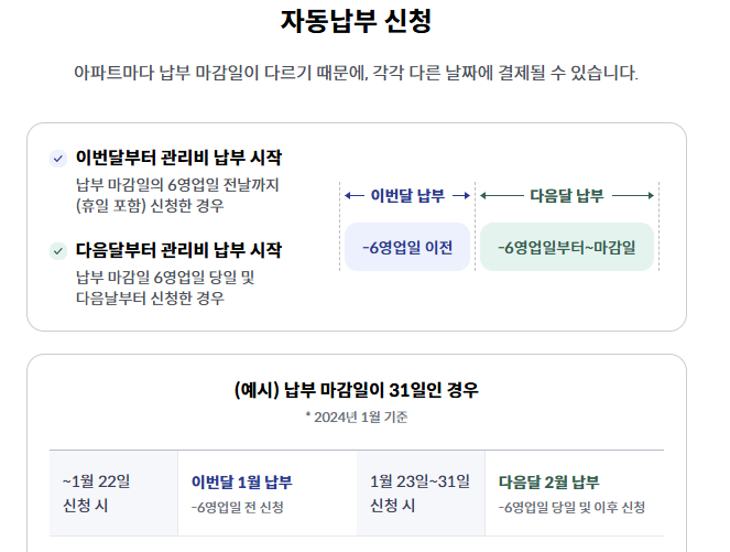 추가로 관리비 외에 전기요금, 수도요금 등도 함께 자동이체 등록이 가능한 경우가 많아 한 번에 통합 신청하는 것이 효율적입니다.