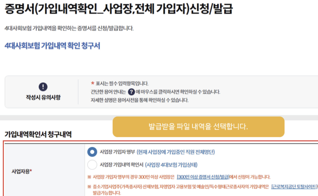 또한 4대사회보험 정보연계센터 웹사이트(www.4insure.or.kr)에 사업장 회원으로 가입되어 있어야 하며, 해당 사이트에서 ‘사업장 로그인’ 권한을 가진 계정이어야 명부 신청이 가능합니다.