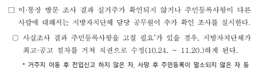 | 장기 거주불명자 | 행정상 주소는 있으나 실거주 여부 불확실한 경우 |