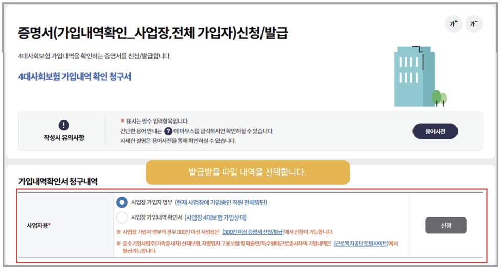 발급 목적에 따라 선택해야 하며, 대부분의 행정 절차에서는 ‘4대보험 가입증명서’를 요구합니다. 선택 후 ‘발급신청’ 버튼을 클릭합니다.