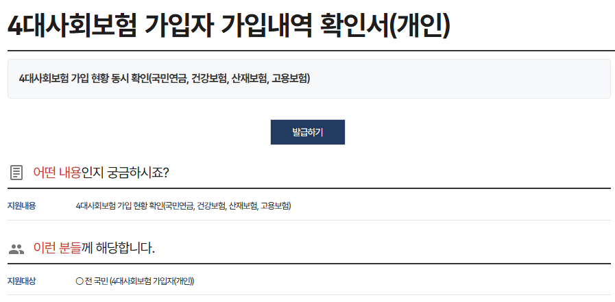 증명서 발급/조회 메뉴에 들어가면 ‘4대보험 가입내역 확인서’와 ‘가입증명서’가 있습니다. 가입내역 확인서는 상세 이력 포함, 가입증명서는 현재 가입 상태 위주로 표시됩니다.