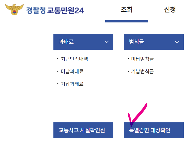 인터넷 또는 모바일 앱에서 본인 인증 후 로그인합니다. - 메뉴에서 ‘특별감면 대상조회’ 선택