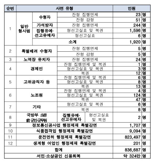 예를 들어, 특정 해에는 경제 활성화를 이유로 중소기업 대표나 경제인이 다수 포함되기도 하고, 사회통합의 일환으로 노동계·시민단체 인사가 포함되기도 합니다. 일반 형사범과 생계형 범죄자도 일정 조건을 충족하면 대상에 들어가는데, 이러한 대규모 인원은 개별 실명 대신 총합 수치만 제공됩니다.