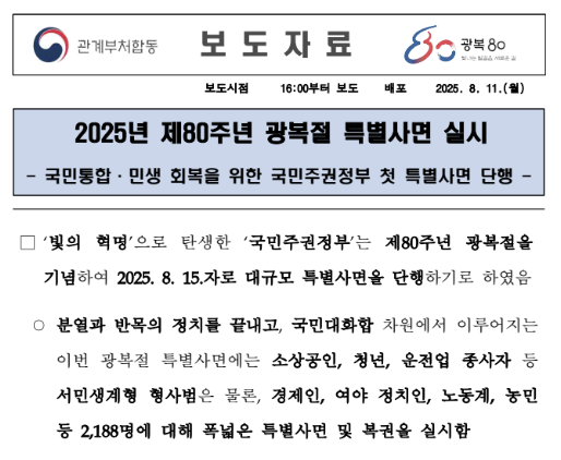 이번 글에서는 8월 15일에 맞춰 시행되는 특별사면의 대상자 명단을 확인하는 방법에 대해 안내해 드리겠습니다. 광복절을 기념하여 진행되는 특별사면은 대통령이 형 집행을 면제하거나 복권하는 조치로, 매년 사회적 관심을 크게 받습니다. 경제인, 정치인, 노동계 인사, 그리고 일반 형사범까지 다양한 인물이 포함되며, 일부는 사회적으로 이름이 잘 알려진 경우도 있습니다.