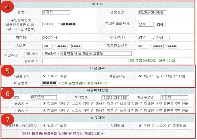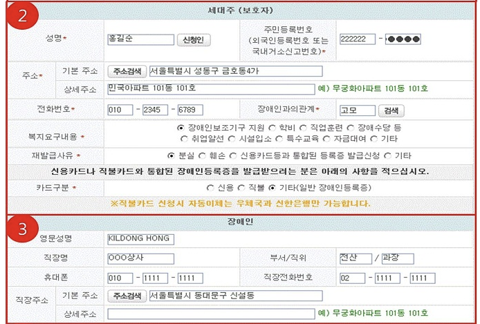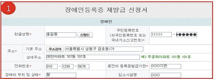 - 담당 직원 안내에 따라 장애인 복지카드 재발급 신청서를 작성합니다.
