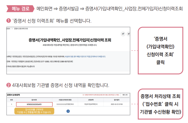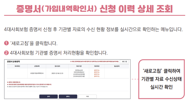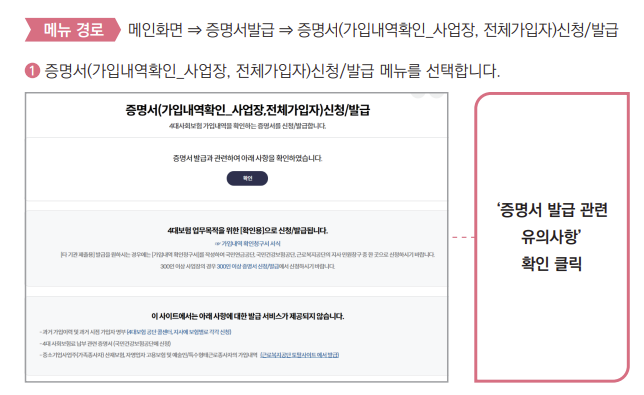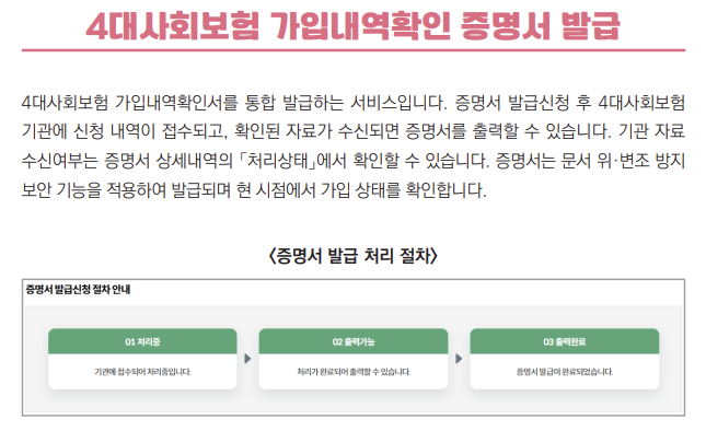 | 오프라인 | 각 보험공단 지사 방문 | 신분증, 사업자등록증 | 과거 특정 시점 자료 발급 가능 |