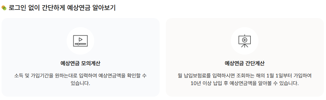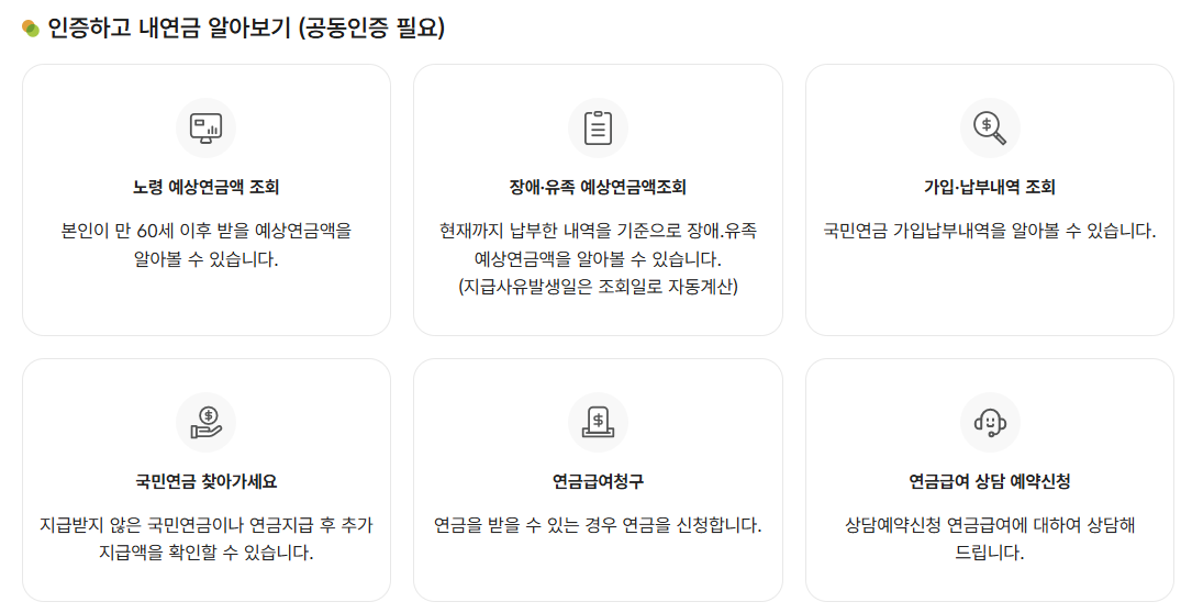 | 국민연금 | 가입 기간, 납부 내역, 예상 연금 수령액 |