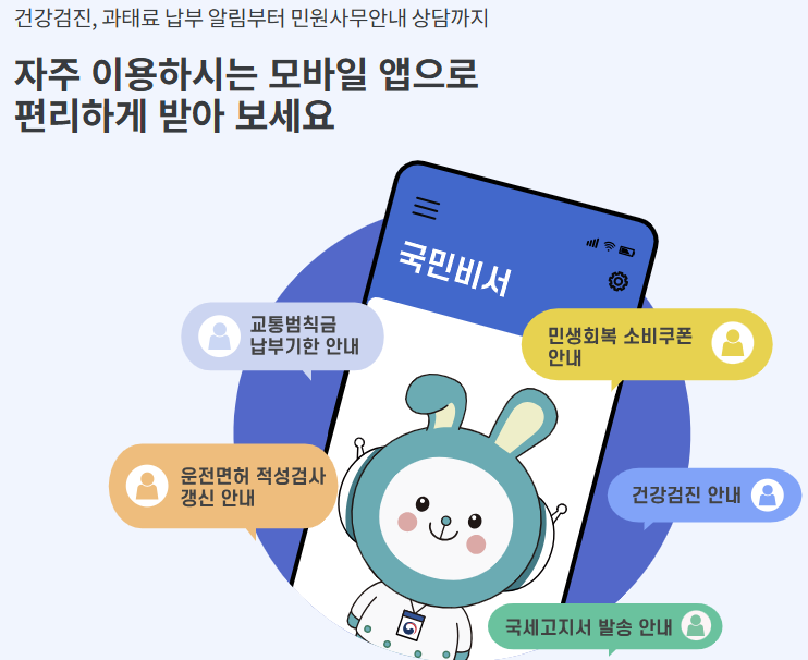 국민비서 누리집 홈페이지는 국민이 일상에서 꼭 필요한 행정 정보를 쉽고 빠르게 확인할 수 있도록 돕는 유용한 서비스입니다. 알림 서비스를 통해 세금, 건강검진, 자동차 검사 등 중요한 일정을 놓치지 않을 수 있고, 상담 서비스를 통해 궁금한 점도 온라인에서 해결할 수 있습니다.